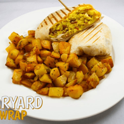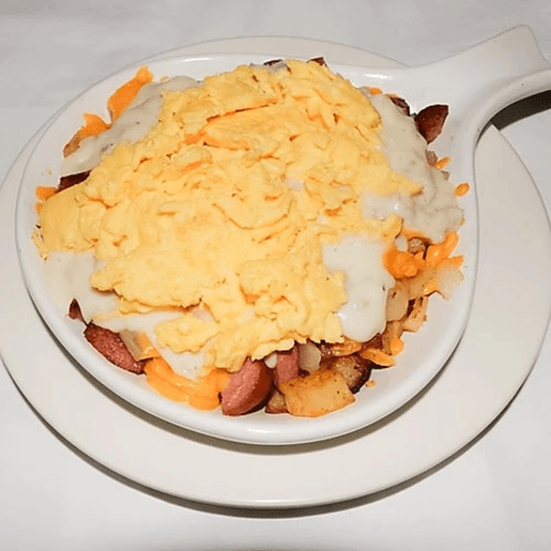 2 scrambled eggs, smoke sausage, onions & American cheese, wrapped in a flour tortilla with a side of country gravy