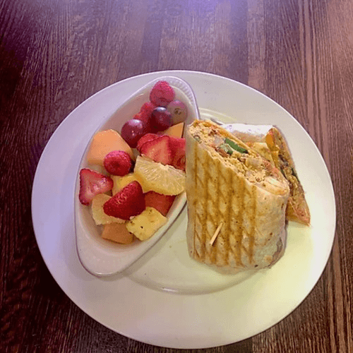 Served on multigrain toast topped with homemade guacamole and two eggs on top. Served with fruit