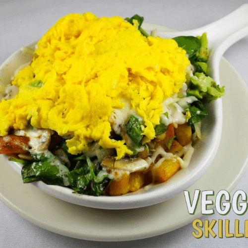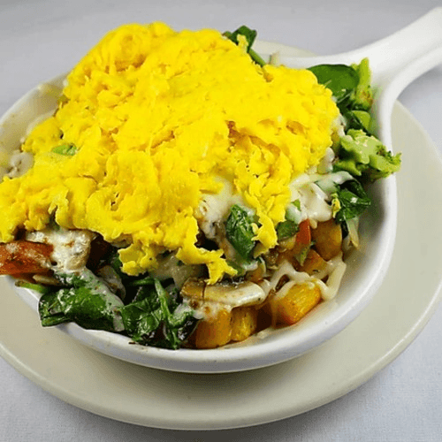 Scrambled eggs, avocado, spinach, bacon, jack and Cheddar cheese topped with hollandaise sauce