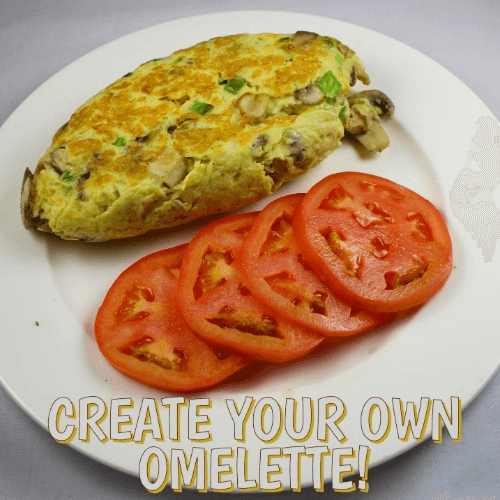 Bacon, sausage, ham, chicken, turkey sausage, gyro meat, or chorizo, onions, tomatoes, mushrooms, broccoli, spinach, avocado, green peppers, American, mozzarella, swiss, cheddar, feta, jack cheese. Choose four ingredients