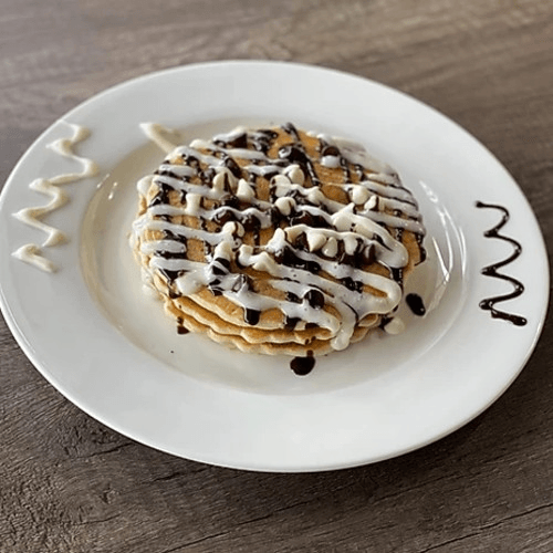 Chocolate chips and white chocolate, drizzled with vanilla cream