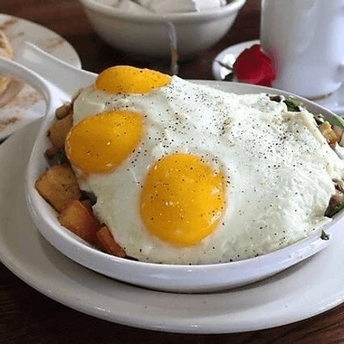 With choice of meat bacon, sausage, links or patties, ham corned beef hash, or turkey patties, Canadian bacon
