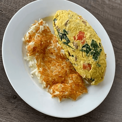 Scramble eggs, smoked sausage, spinach, oven roasted tomatoes, provolone cheese