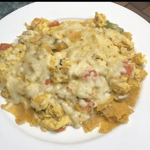 Scramble eggs, tortilla chips, chicken, tomatoes, green onion, pepper jack cheese, salsa verde & sour cream