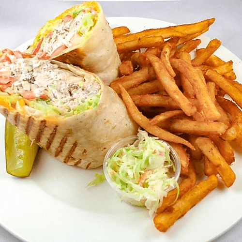 Grilled chicken, shredded cheddar, lettuce, and tomato smothered in spicy buffalo and ranch dressing